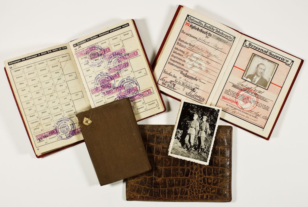 An excellent group of items once belonging to Lt. Herbert Viegel who served with the 4th Infantry Division of the Wehrmacht, was twice wounded and awarded the Iron Cross, First Class. Included in the lot is: a non-descript 3 1/4" x 4 1/2" brown cloth-covered notebook bearing a few dated notes within, being notable for having been clearly penetrated by a bullet at one corner, piercing the book at an oblique angle; two-part dog tag; NSDAP Party membership book; Deutsche Arbeitsfront book showing contributions until December, 1938; Veigel's pin-back Iron Cross, First Class, arms slightly bent and with some surface wear, late war Infantry Assault Badge marked "FZS", and black Wound Badge; a hand-made faux alligator skin leather pocket wallet lined with SS camouflage fabric; a black leather map or drawing case, 7 1/2" x 11", possibly post-war, with modern pencils and a field dressing within, and three photo albums. One of the albums has been professionally made and lettered. Generally, all of the photos show the Viegel during the occupation of France. Included are scenes of target shooting, marching across rural France, German columns marching through the streets of Paris and other French cities, French being loaded into a freight car, German soldiers' cemeteries and burials, and German Atlantic coastal pillboxes. Overall very good condition. The German 4th Infantry Division was one of the first divisions raised and to serve during World War II. It took part in the invasion of Poland in 1939 and in the invasion of France in 1940. Later that year it was converted into the 14th Panzer Division which was completely destroyed at Stalingrad.