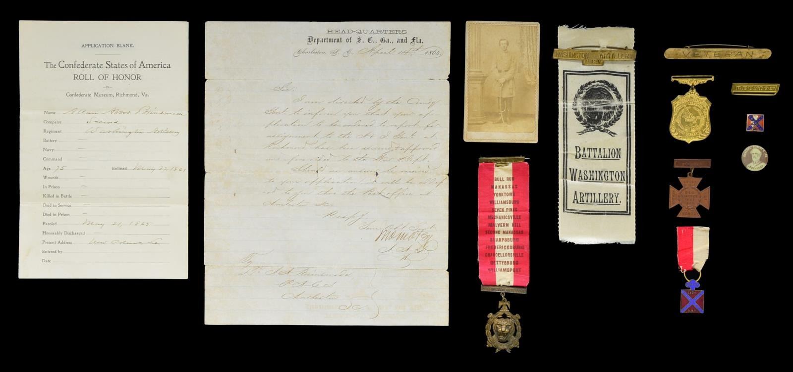 ARTILLERY OF NEW ORLEANS. Alan Abbot Brismade (1831-1910) had a most colorful military career & among the very few Civil War soldiers born in Hawaii. Prior to the Civil War, Alan joined the Illinois militia, volunteers for Utah in the Mormon War of 1858. He settled in New Orleans & joined the Washington artillery April 27, 1860; when the Civil War began he was appointed 3rd Sgt. of the Washington Artillery while in Virginia, later appointed 1st sergeant at Bull Run June 28, 1861 & elected Lieut. November 1861. Appointed 2nd Lieut. of artillery by Jefferson Davis September 1863. Appointed 1st lieutenant in May 1864. He served the entire war & was paroled at Jackson Mississippi May 1865. After the Civil War, Brinsmade joined Mexican resistance as Lieut. Col. against Emperor Maximilian. He returned to New Orleans & was involved again w/ Washington Artillery Veterans Assn.. He is buried in Metairie, LA. 1) CDV in Confederate officer’s uniform holding sword, overall fair condition w/ soiling & penciled identification on verso. 2) Lieutenant appointment request signed by Capt. Otey, General Beauregard’s adjutant, April 14, 1864. Good overall, soiled, cracked at folds, small reductions, all easily read. 3) Inscribed Southern Cross of honor “A A BRINSMADE”. 4) Rarely seen original application “Confederate States of America, Role of Honor” for the Confederate Museum in Richmond, filled out by Brinsmade, detailing his activity in Washington Artillery 1860-1865. 5) Rare Washington Artillery 4 piece veteran membership badge w/ Louisiana state seal above crossed cannons & lion head inside wreath engraved in script on verso “A A Brinsmade April 17th 1860” & stamped “1861-1865 CSA”. Supporting ribbon has WA battles starting w/ Bull Run ending w/ Williamsport. Good condition overall, areas frayed on edges of ribbon. 6) Enameled .75” battleflag representing “Louisiana division, ANV” badge on red and white silk ribbon. Good overall 7) Small .5” gold enamel battle flag, collar tab, poor chipped enamel. 8) 1906 Southern Memorial Association, New Orleans 2 piece gilted brass badge, good overall. 9) 7” “Battalion Washington Artillery” ribbon w/ brass top “WASHINGTON ARTILLERY / U.C.V.” Brass top is separated from ribbon. 10) 1907 R.E. Lee celluloid, good condition. UNATTACHED ACCESSORIES: Xeroxed biographical data & copies of a few photos. CONDITION: as noted above. (02-14879/JS). $3,500-5,000.