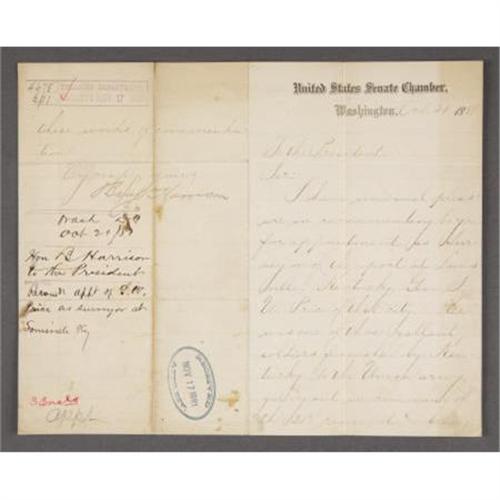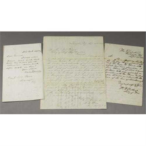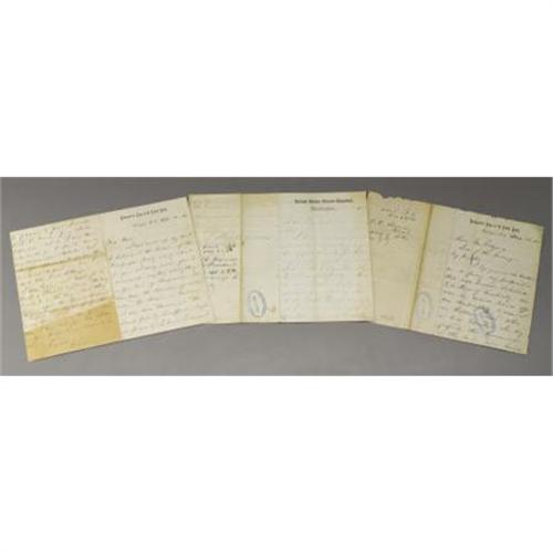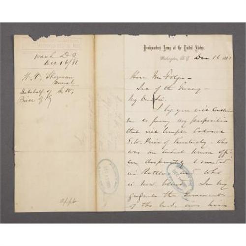 <B>ARCHIVE OF U.S. GENERAL SAMUEL WOODSON PRICE</B></I> Famed Kentucky artist and hero of Kennesaw Mountain, including letters from Sherman, Sheridan, Rosecrans, Benjamin Harrison, and others. Price was born in 1828 near Nicholasville, Kentucky. His early career was spent as a portrait artist and he studied in New York City at the Art School of Design. He was commissioned into the 21st Kentucky Infantry on February 26, 1862 as a colonel. His brigade became part of the Army of the Cumberland and he was seriously wounded at Kennesaw Mountain taking a bullet near the heart. Only some brilliant battlefield surgery saved his life. The near-fatal injury precluded him from battlefield duty and he was given a post position in Lexington, Kentucky. Congress awarded him the rank brevet brigadier general in 1865 for meritorious service at Kennesaw. After the war, Price continued to paint. He completed a series of Union general portraits including Generals Rosecrans and Sherman. Two of his works, <I>Caught Napping</B></I> and <I>Gone Up,</B></I> were awarded gold medals at the Cincinnati Exposition of 1872. In the early 1880s, Price lost vision in both eyes, ending his career as an portraitist. No longer able to paint, he turned to writing, completing a series of essays about Kentucky artists entitled <I>The Old Masters of the Bluegrass</B></I> and a book about his old unit <I>A History of the 21st Kentucky Infantry.</B></I> Price died in 1918 and is buried in Arlington National Cemetery. His works can be found in the National Portrait Gallery and several fine museums and institutions. <BR><BR>Just a few highlights of this well-researched and organized archive includes: <BR><B><BR>General William S. Rosecrans Autograph Letter Signed</B></I> "<I>W. S. Rosecrans</B></I>". One page, 4.75" x 7.75" plain paper, New York, September 10, 1868, to Price in regard to sitting for a portrait. In full: "<I>Dear General, I shall return home next week and will try to give you the sittings you desire week after next in Cin. O. Your friend.</B></I>" The result of this sitting is now hanging in the National Portrait Gallery at the Smithsonian Institution. Fine condition. <BR><B><BR>General William T. Sherman Autograph Letter Signed</B></I> "<I>W. T. Sherman</B></I>". Four pages, 5" x 8" lined "Headquarters of the United States" letterhead, Washington, D.C., April 10, 1877, to Price in answer to Price's apparent request for Sherman to sit for a portrait. A very interesting letter that reveals Sherman's lack of regard for some of the artists and photographers of the day. In part: "<I>Dear Price, I had made up my mind to submit to the torture of the photograph, purely out of respect for you. I surely want you to accomplish anything and everything in your line of profession... Mora of New York has of me photographs of every notion and kind- standing - in bust - in Uniform and in civil dress.- These are the best extant. Those of Brady are simply monstrous...</B></I>" Fine condition save for one area of dark toning, expected folds. <BR><B><BR>General Philip H. Sheridan Manuscript Letter Signed</B></I> "<I>P. H. Sheridan</B></I>". 1.5 pages, 8" x 10.5" "Headquarters Mil. Div. of the Missouri" letterhead, Chicago, April 28, 1881, to General A. M. Stout. Sheridan testifies as to Price's war record. In part: "<I>...His record as a man and an officer was excellent and it would give me great pleasure to learn that his friends had succeeded in obtaining from the government some recognition of his services.</B></I>" Original folds, else very fine.<BR> <BR><B>Senator Benjamin Harrison Manuscript Letter Signed</B></I> "<I>Benj. Harrison</B></I>". 2.25 pages, 5" x 8" lined "United States Senate Chamber" letterhead, Washington, D.C., October 21, 1881, to the President Chester A. Arthur . Harrison recommends Price for the position of Surveyor at the Port at Louisville, Kentucky, writing in part: "<I>...He was one of those gallant soldiers furnished by Kentucky to the Union Army... He was wounded in the desperate assault made by our troops on Kennesaw Mountain...and is now suffering from the effects of that wound. He is an excellent man...I do not often interfere with appointments from the States but I cannot withhold from Gen. Price these words of commendation.</B></I>" Light toning, a couple of stains, original folds, else about fine. <BR><B><BR>General William T. Sherman Autograph Letter Signed</B></I> "<I>W. T. Sherman General</B></I>". 1.25 pages, 5" x 8" lined "Headquarters of the United States" letterhead, Washington, D.C., December 16, 1881, to Secretary of the Treasury Charles A. Folger. Sherman is requesting Folger's help in securing assistance for General Price who is now blind. In part: "<I>In my judgment the Government of the U.S. owes him a debt which cannot be too generously paid.</B></I>" Some toning, a tiny tear at one fold, else about fine. <BR><BR>Accompanying this excellent group of correspondence is a substantial amount of collateral and research material including biographical information, photocopies of his military records, and a copy of the book <I>Three Kentucky Artists Hart, Price, Troye</B></I> by J. Winston Coleman Jr. (Lexington: University Press of Kentucky, 1974).<BR><BR><b>Shipping:</b> Books & Catalogs (<a target="_blank" href="http://www.heritageauctions.com/common/shipping.php">view shipping information</a>)