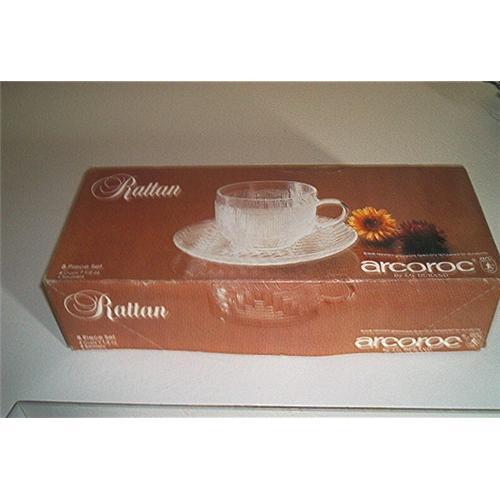 Featuring a Mint In Box set of RATTAN cups and saucers. Contains 4 cups (7 1/2 ozs), along with 4 matching saucers. Durand Glass Manufactuing Co. #EB40/83, Millville, NJ., USA. #60-54080. This set has been tempered to make it stronger, more durable and safer than ordinary glass. However it is not unbreakable. Saucers measure: 5 1/2 inches in diameter; This is a beautiful set of 8 pieces still mint in box. Each saucer has a gold sticker which states: Specially Tempered glass for added resistance and durability. ARCOROC-USA.