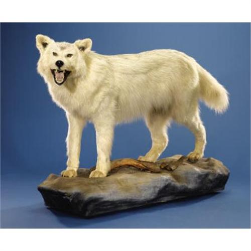 <B>ARCTIC WOLF FULL-BODY MOUNT</B></I><BR> <I>Canis lupus arctica</B></I><BR>The Arctic Wolf lives in northern Alaska and is very intelligent, cunning, and alert. They are opportunistic and very adaptable, living their lives in a harsh cold environment and working together in packs or small groups to hunt for food. They will fight to the death to defend their mate or young. This particular mount is of a large old male, weighing about 140 lbs. Presented on a diorama base, the mount comes with all legal papers and measures 59 inches long, 40½ inches high and 19 inches wide. <BR><BR><b>Shipping:</b> Requires 3rd Party Shipping (<a target="_blank" href="http://www.heritageauctions.com/common/shipping.php">view shipping information</a>)