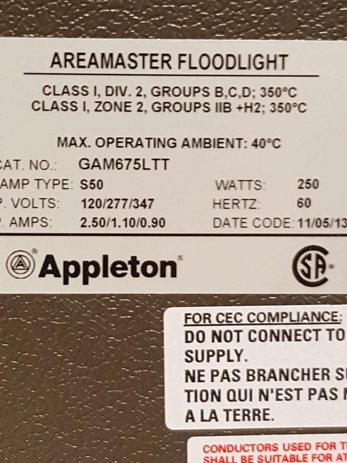 AREA MASTER POLE MOUNTED FLOODLIGHT BY APPLETON 120/277/347V 250W