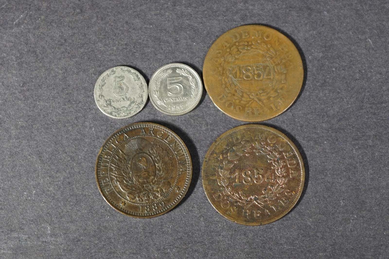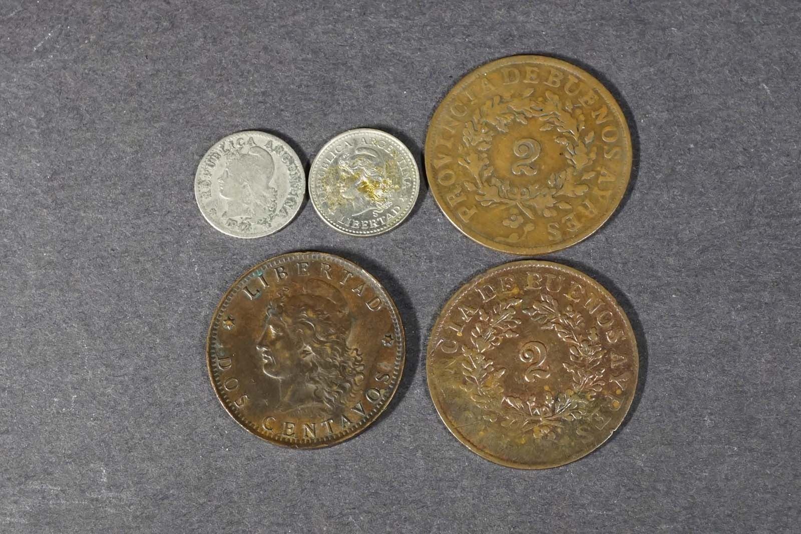 1889 KM #33 2 centavos Very Fine & 2 (1912-1957) 5 centavos Circulated Plus 2 Buenos Aires city coins 1854 KM #9 in XF & Fine condition.