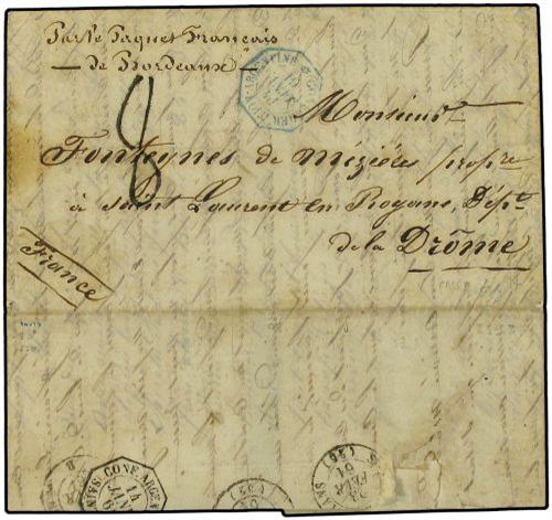 1861 BUENOS AIRES a FRANCIA. Marca al frente en azul CONFEDERATION-ARGENTINE y al dorso en negro CONF. ARGENTINE/SAINTONGE 14 JANV. 16, primer dia de utilización según cat. KNEITSCHEL. Salles 1030 y 1057. Firmado LAMY.