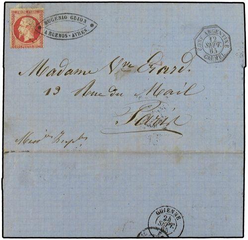 1865 BUENOS AIRES a FRANCIA. Circulada con sello francés de 80 cts. carmín, mat. ANCLA, fechador octogonal CONF. ARGENTINE/CARMEL (Salles 1034) y al dorso fechador del paquebot GUINNE/* (Salles 1003). Rarísima combinación de fechadores.