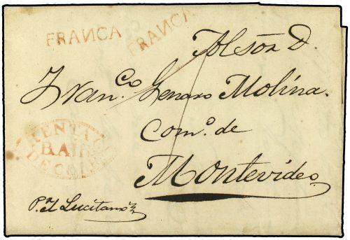 1845 (13-Enero) BUENOS AIRES a MONTEVIDEO. Marcas RENTA GL DE CORREOS / B. AIRS. y FRANCA ambas en rojo.