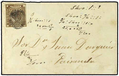 5 BUENOS AIRES a PAISANDO. 4 reales castaño. Mat. "PONCHITO". PRECIOSA.