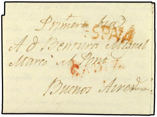 1804 (12-Enero) CADIZ a BUENOS AIRES. Marca lineal CADIZ y ESPAÑA aplicada en La Coruña, manuscrito "Primera Via".