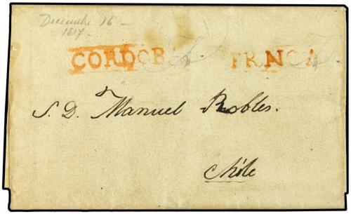 1817 (16-Diciembre) CORDOBA a CHILE. Marcas CORDOBA y FRANCA ambas en rojo. MAGNIFICA.