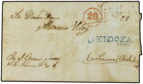 1855 (24-Enero) CORDOBA a SERENA (Chile). Marca MENDOZA en color azul (Kn.4) tasa de 20 ctvos. a la llegada.