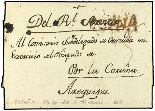 (1805 CA.) Envuelta circulada a AREQUIPA (Peru). Marca ESPAÑA aplicada en La Coruña y manuscrito "Del Real Servicio"