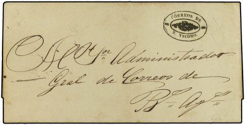 (1860 CA.) Envuelta circulada a BUENOS AYRES. Marca CORREOS DE / S. YSIDRO en negro. MAGNIFICA Y RARA.
