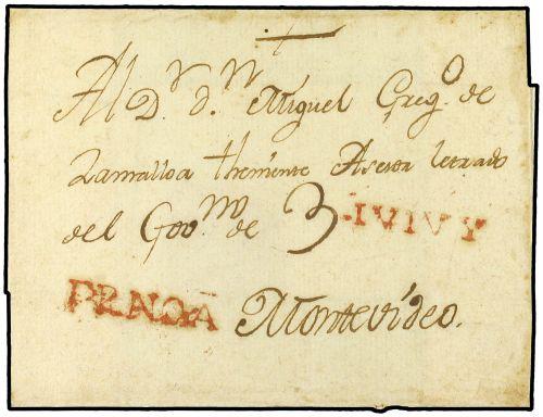 (1810 CA) Envuelta circulada a MONTEVIDEO. Marca IVIVY y FRANCA ambas en rojo. RARA.