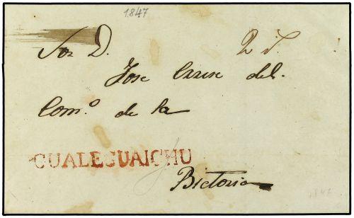 (1847 CA.) Envuelta circulada a VICTORIA. Marca GUALEGUAICHU en rojo. MAGNIFICA.