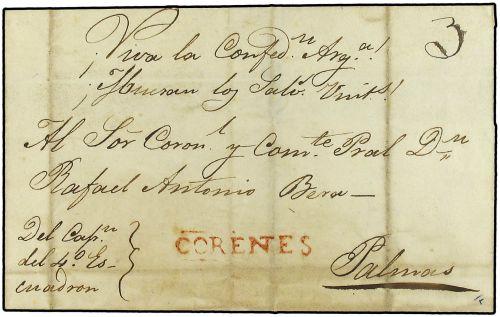 (1858 CA.) Envuelta dirigida a PALMAS. Marca CORRIENTES en rojo. Manuscrito "Viva La Confederación Argentina".