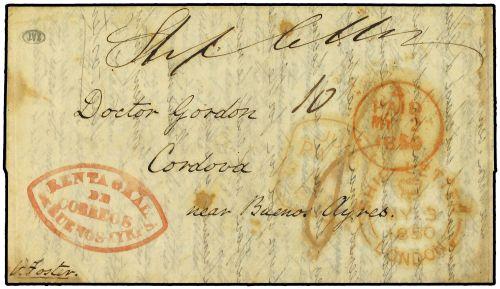 1850 (1-Mayo) GLASNEVIN (Irlanda) a BUENOS AIRES. Marca de tránsito de Londres y llegada RENTA GRAL. DE CORREOS / BUENOS AYRES en rojo.