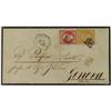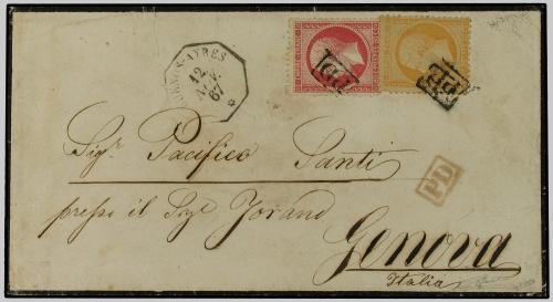 1867 (Nov 12) Mourning envelope from BUENOS AIRES to GENOA franked at 1 fr. 20 c. rate with France 1862 40 c. and 80 c. solely tied by two strikes of framed P.D. in black, with octagonal BUENOS AYRES Consular marking (Salles 1058) and carried on the Aunis to Rio. Transhipped to the Guienne for delivery (Nov 24) to Bordeaux and thence Genoa. Perforation fault to 40 c. and slight tear to envelope. The only recorded usage of the "PD" used as a canceller on a South American Line cover.