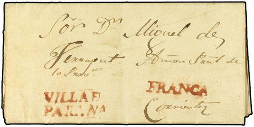 1823 (27-Sept) PARANA a CORRIENTES. Marcas VILLA D. / PARANA y FRANCA ambas en rojo. MAGNIFICA Y RARA.
