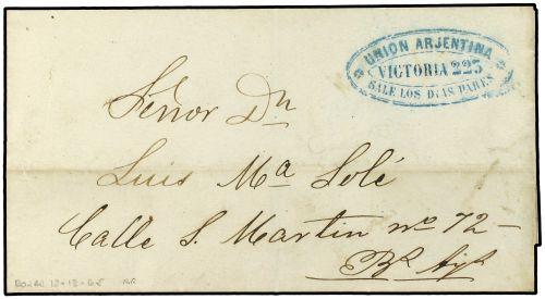 1865 (12-Diciembre) ROJAS a BUENOS AIRES. Marca UNION ARGENTINA / VICTORIA 233 / SALE LOS DIAS PARES.