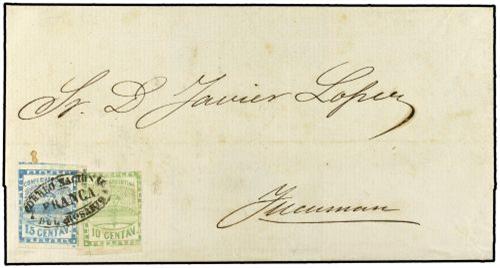 1858 ROSARIO a TUCUMAN. 10 cents verde y 15 cts. azul, márgenes muy ajustados y cortos. Rarísima combinación de franqueo. Cert. B. MOORHOUSE.
