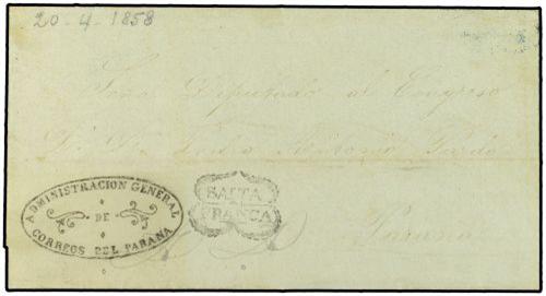 1858 (20-Abril) SALTA a PARANA. Marca SALTA/FRANCA y ADMINISTRACION GENERAL DE CORREOS DEL PARANA.