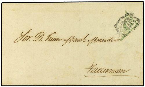 2b 1859 SALTA a TUCUMAN. 10 céntimos verde bisectado diagonalmente, mat. SALTA/FRANCA en negro.