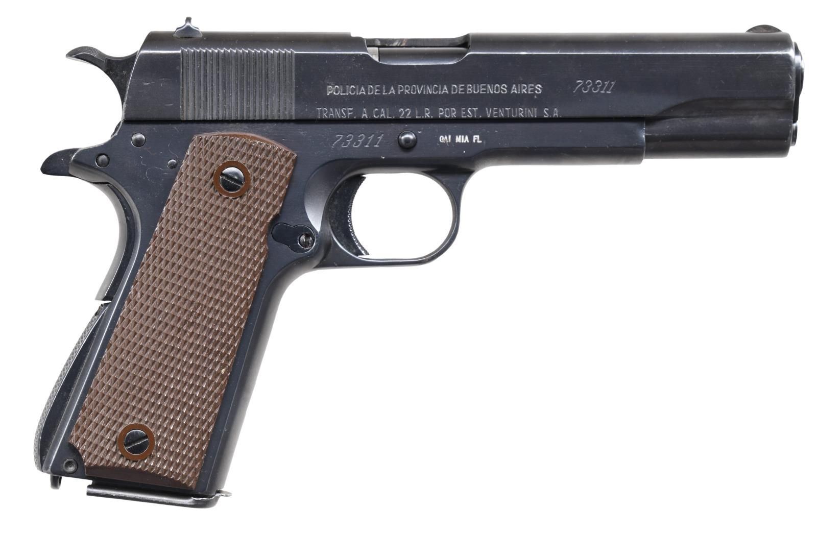 SEMI AUTO PISTOL FOR BEUNOS AIRES POLICE. Cal. 22 LR. S# 73311 (1952). A Sistema pistol converted to 22 LR utilizing a free floating chamber; right side of slide marked "TRANS. A. CAL. 22 L.R. POR EST VENTURINI S.A.". Matching S# 73311 on "5 barrel, floating chamber, & slide. Right side of the frame has the import mark "GAI MIAMI FL". Two-piece brown checkered plastic grips similar to Coltwood. MAGS: 2–10 rd., electro-penciled "82117" and "103135". CONDITION: pistol has an export-reblued finish. Very good grips. Very good bore. (23-6938/MD). CURIO. $1,100-1,400.