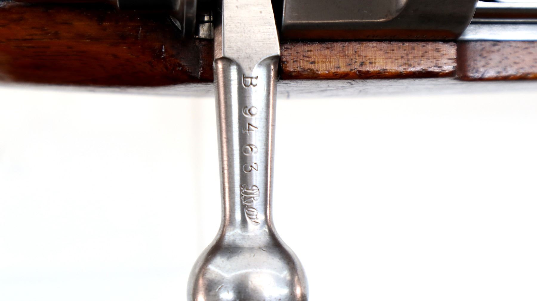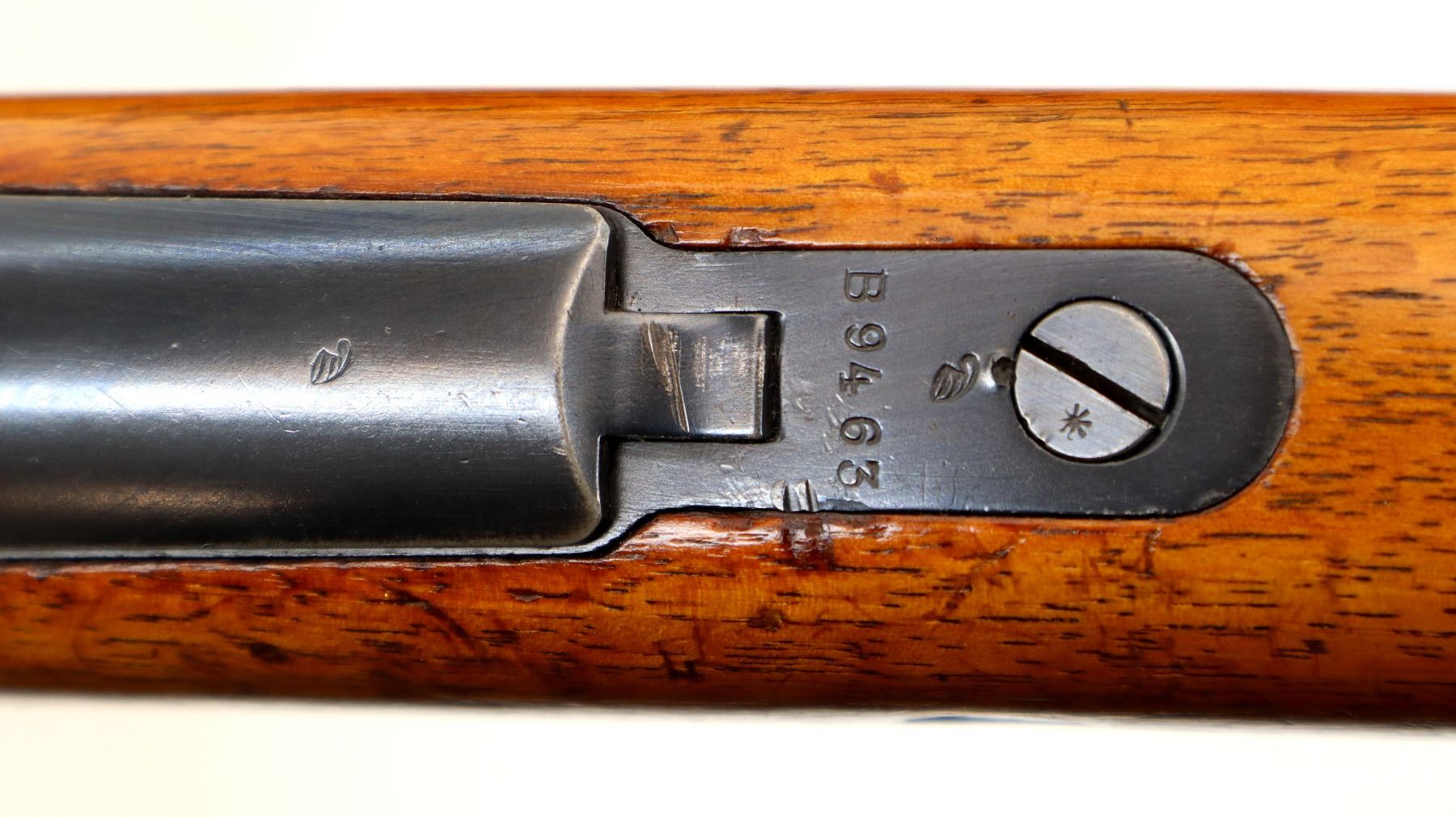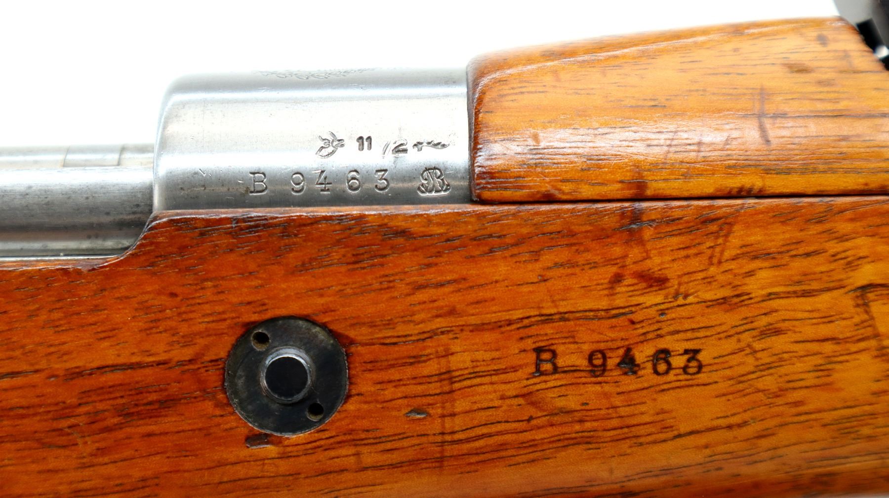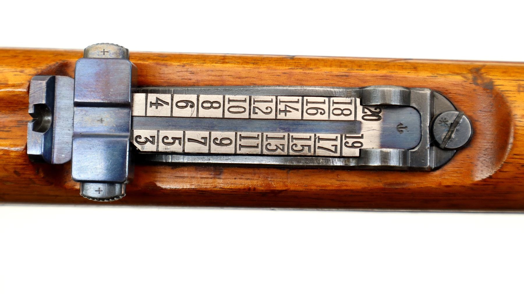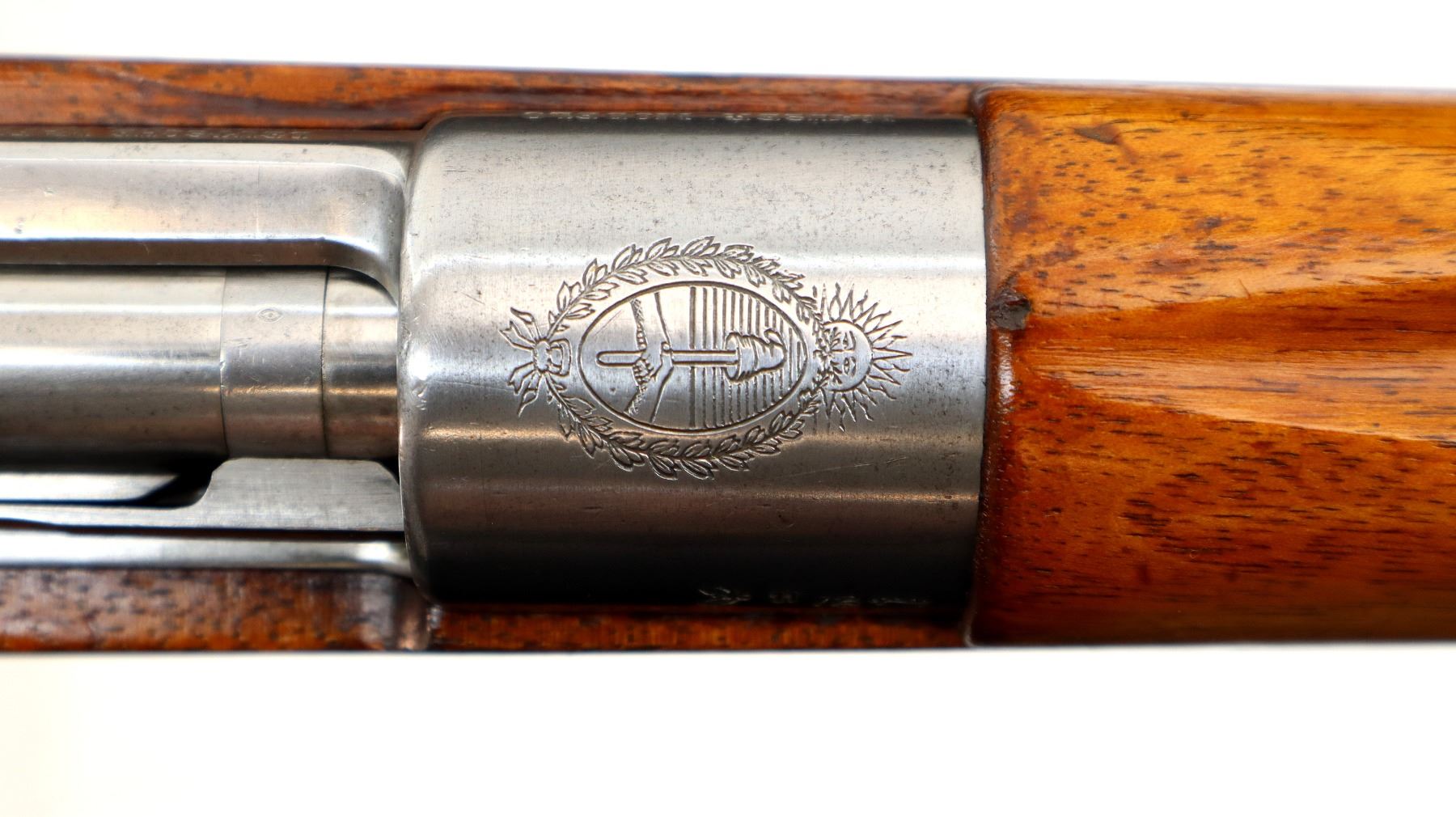 Main Description: Manufactured by DWM Berlin, visible serial numbers match. Barley corn front sight with ramp, adjustable u notched rear sight, blued finish, silver receiver with Argentine crest, straight bolt handle. Two piece full military wood stocks, pistol grip, smooth steel butt plate, sling swivels, bayonet lug, cleaning rod.