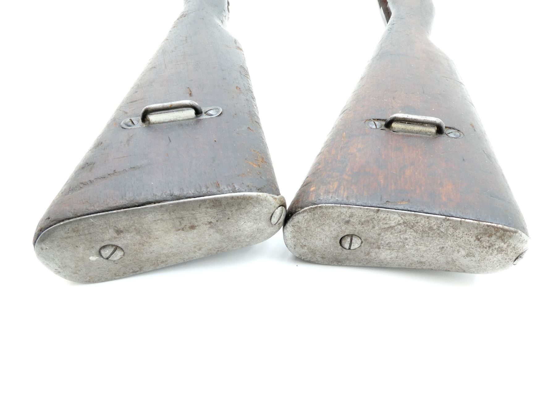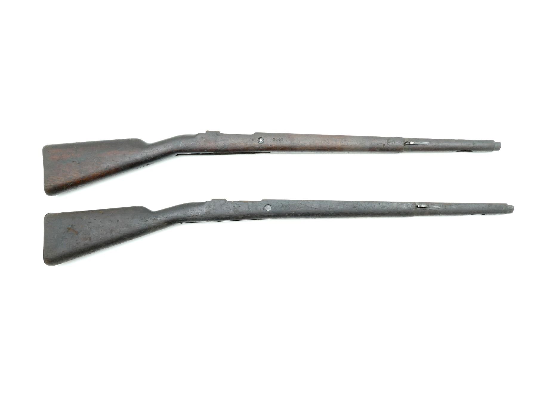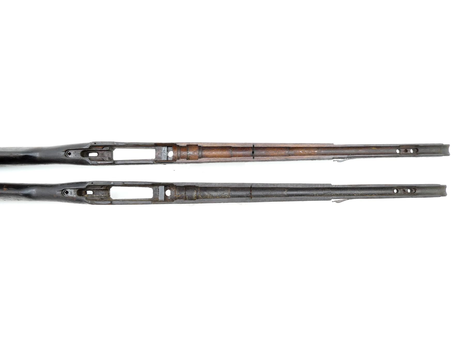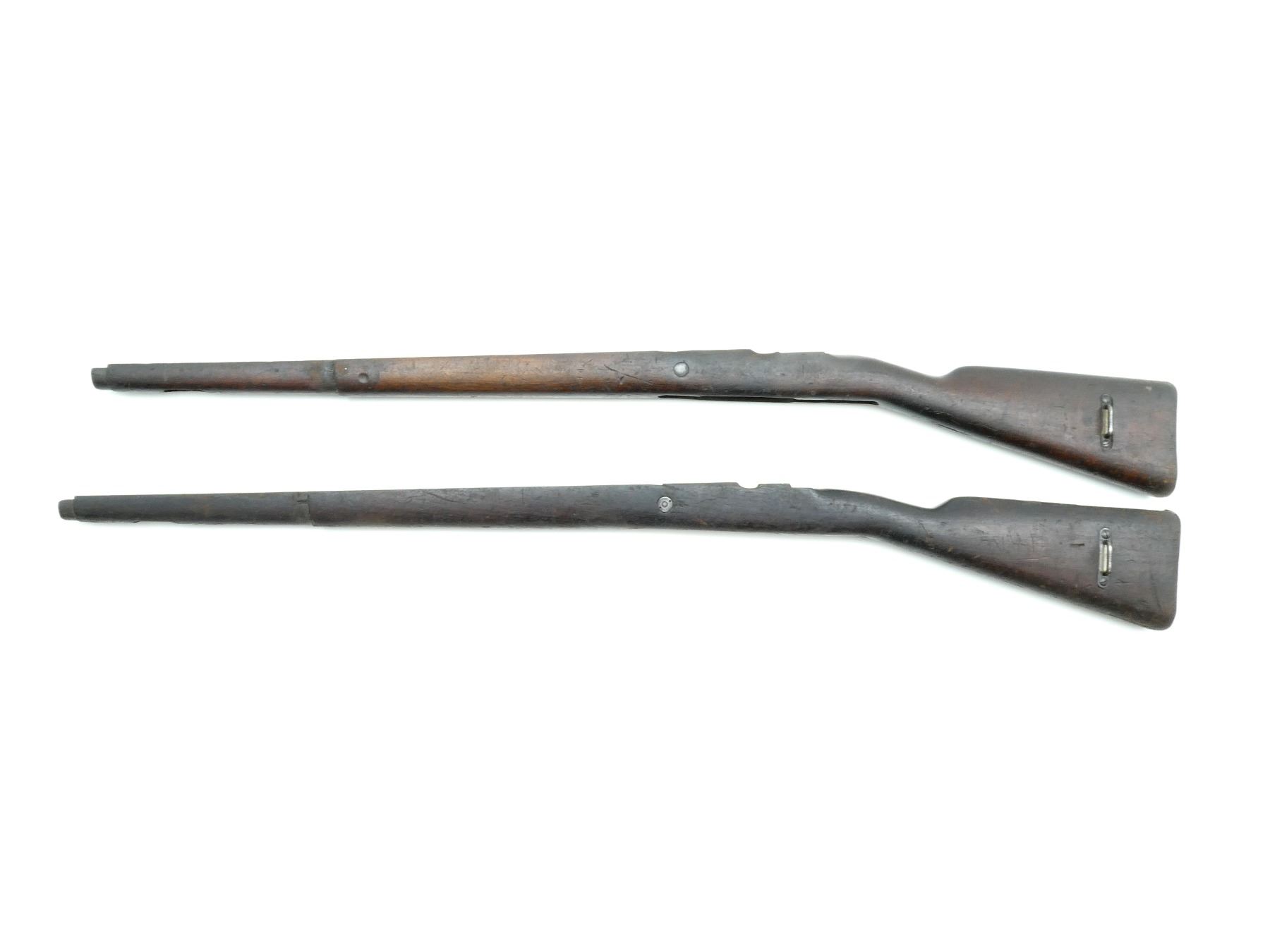 LOT INCLUDES; (2) WOODEN STOCKS, SMOOTH, STRAIGHT GRIP, STEEL BUTT PLATE, REAR SLING SWIVELS, RECOIL LUG, BARREL BAND SPRING, MAY HAVE SMALL CRACKS & CHIPS / SHOWS WEAR / TEAR, ONE WITH FAINT / UN-CLEAR MARKING, OAL APPROX. 41.5". MAY REQUIRE FITTING. SEE PHOTOS.