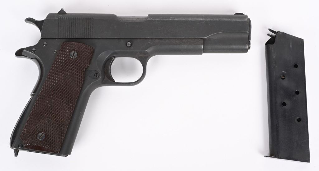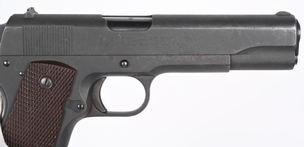 SERIAL NUMBER 956 BARREL 5" CALIBER .45 ACP, MANUFACTURED 1927-1937. Produced by Colt for the Argentine Military. Parkerized finish with checkered brown plastic grips. Short checkered trigger, checkered short wide hammer. Keys pattern brown fiber plastic grips. Matching numbers on frame, barrel and slide. CONDITION. Good as refinished with parkerized exterior over some very light areas of pitting. Action operates properly. Bore is good with slight frosting in corners of grooves. C&R