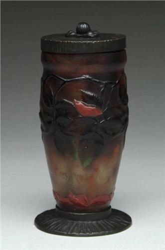 ARGY ROUSSEAU PATE DE VERRE NITE LITE. Red roses and green leaves on purple to maize mottled background. Molded signature on the side "G ARGY-ROUSSEAU" and "FRANCE" on the top rim. SIZE: Overall height is 7-1/2". CONDITION: Glass is very good to excellent. Contemporary wrought iron hardware. 5-62161