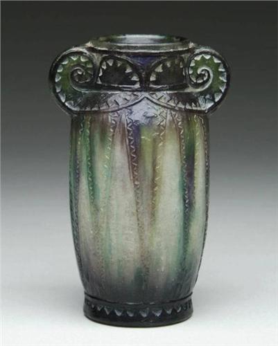 ARGY ROUSSEAU VASE. Wonderful Pate de Verre vase has molded design running vertically on the body of the vase with some emerald green stripes in the background. Top is olive green with molded design shading to lime green within the solid handles. Spots of royal blue in the rim background. Signed on the side of the vase "G. ARGY-ROUSSEAU". SIZE: 6-1/4" t. CONDITION: Interior sickness, otherwise good. 5-62483