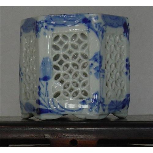 Here is what appears to be a beautiful hand painted reticulated Arita Sometsuke tea ceremony cup stand possibly, Hirado. The stand dates to pre 1900, and is unsigned. There are similar pieces shown on Trocadero for sake, though this appears to be for Tea ceremony.