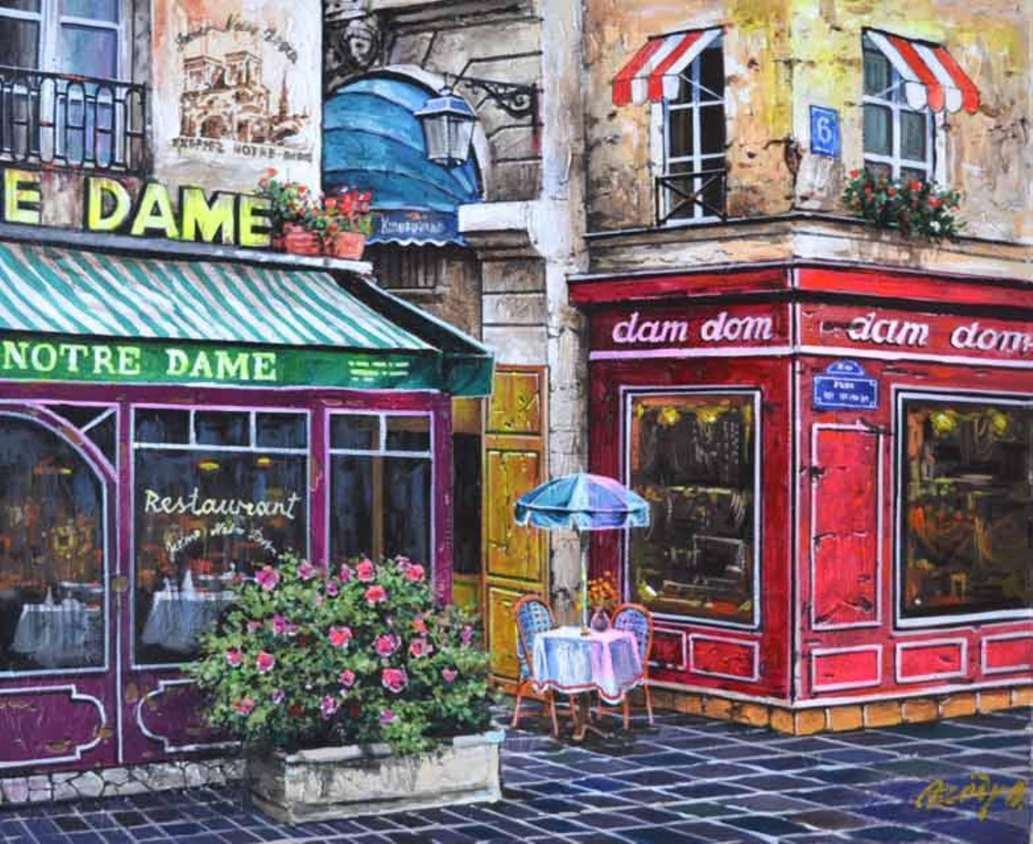 Artist: Arkady Ostritski (b. 1948) - Title: Notre Dame Restaurant - Medium: Acrylic on Canvas - Signature: This one-of-a-kind work is hand-signed by the artist at the bottom of the image - Image Size: Approximately 17.5 inches x 21.75 inches - Unframed