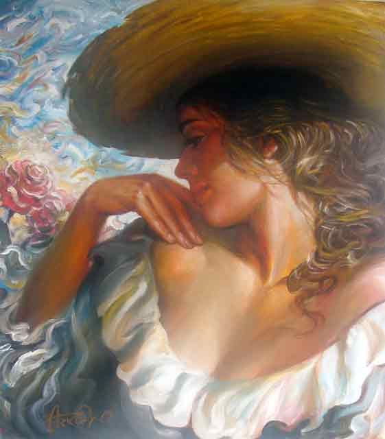 ARKADY OSTIRTSKI "THOUGHTFUL" COLLECTABLE ORIGINAL OIL ON CANVAS HAND SIGNED BY THE ARTIST. SIZE: 23.5" X 19.75", COMES WITH COA AND UNFRAMED. J1275