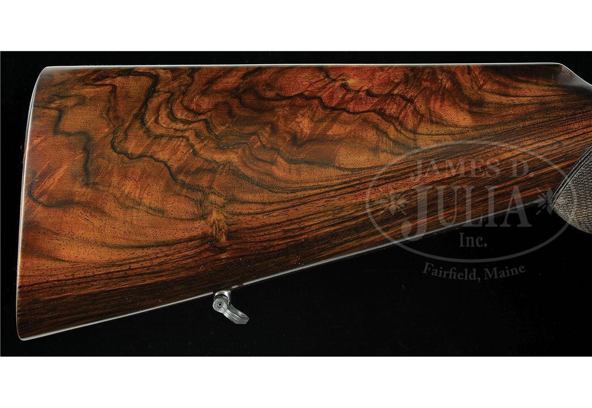 SN 27-03-036-12. Cal. 20 ga. 2-3/4" Chambers. 28" Chopper lump bbls with semi-raised, narrow, concave rib are engraved "ARMAS GARBI SPAIN" and "WILLIAM LARKIN MOORE SCOTTSDALE AZ, Mod. 103A SPL". Bbl flats are stamped with Spanish nitro proofs, SN, and gauge. A sling loop is attached to bottom rib. Coin finished, round bodied, H & H style, sidelock action features automatic safety, single non-selective trigger, bushed strikers, and gold line tumbler end cocking indicators. Action is engraved with 80% coverage small and medium scroll with rose bouquet highlights. "Armas Garbi" is in lozenge on bottom of action over "Eibar". Matching scroll engraved trigger guard has three digits of SN on tang. Very fine flame crotch and dark veined European walnut semi-pistol grip buttstock measures 14-5/8" over checkered wood butt. There is a sling loop on toe line, and point pattern checkering with mullered borders at grip. Matching small beavertail ejector forend has Anson release. Bore diameter: left-.621, right -.621. Bore restrictions: left -.020 (Mod), right -.012 (IC). Wall thickness: left -.031, right -.029. Drop at heel: 2-1/4", drop at comb: 1-1/2". Weight: 6 lbs. 7 oz. LOP: 14-5/8". High quality brown leather case with stitched leather corners has "C. C." embossed on top, has maroon canvas trimmed outer cover with "C. C" embossed on central leather oval, and is lined in dark green cloth with embroidered Garbi label on lid. Case contains proof certificate. CONDITION: Essentially as new, appears unfired, except for proof. Case is excellent, as new. Current retail for this model is over $15000.00.ÊÊ 4-48872 MGM145