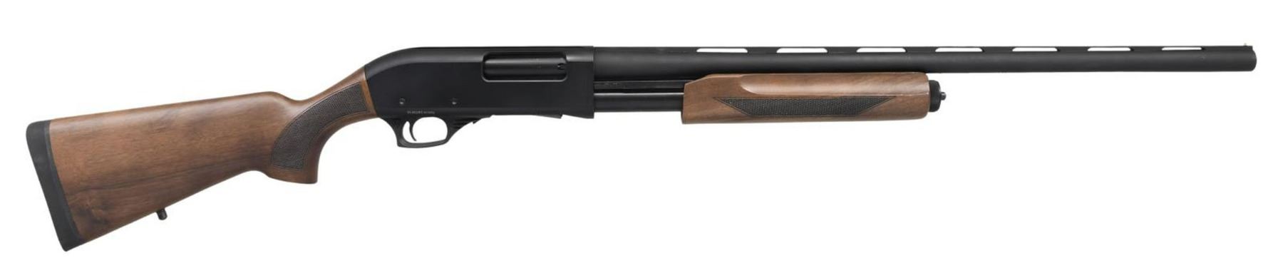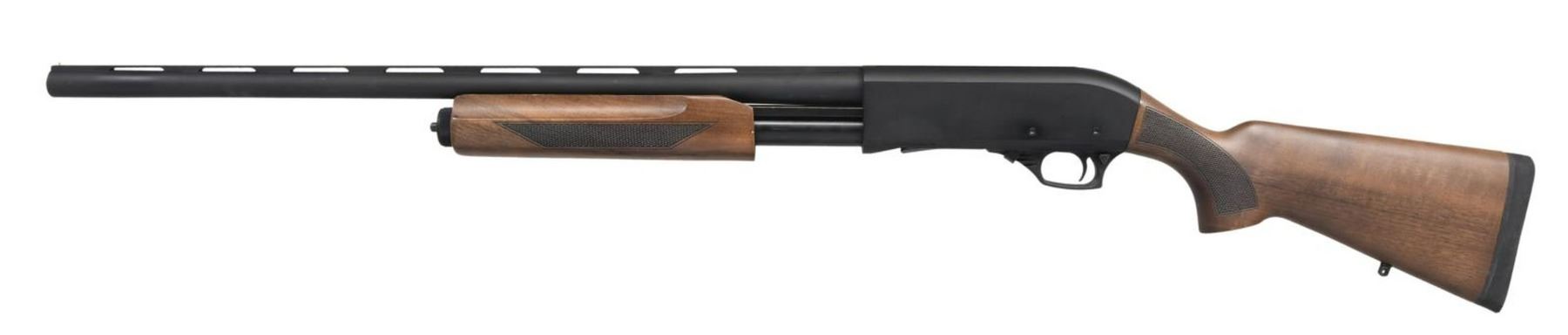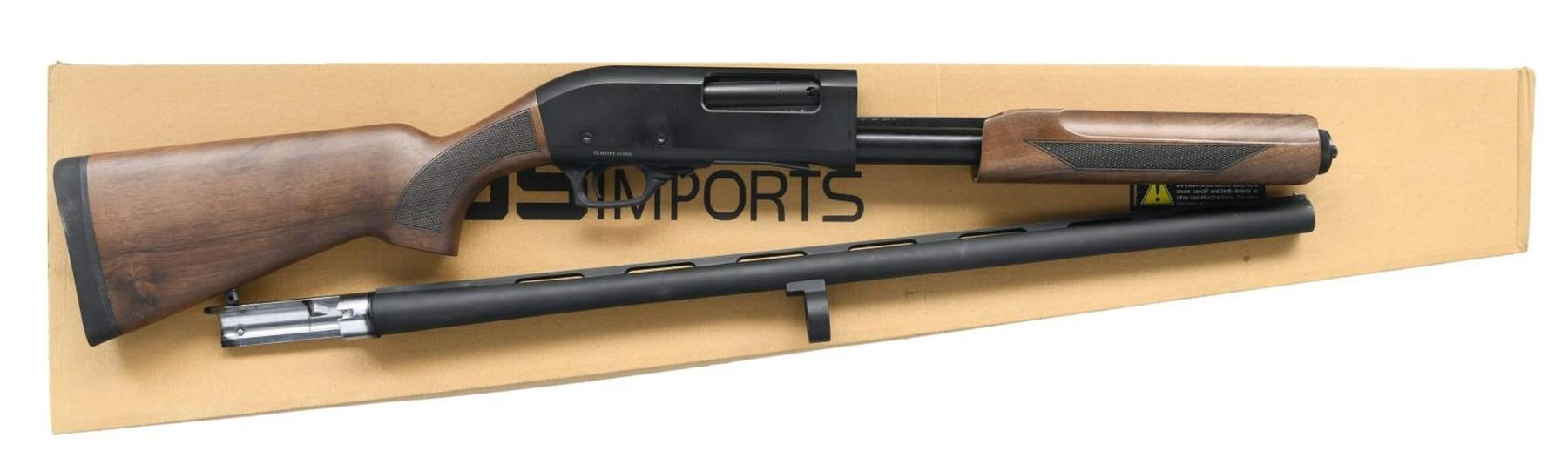 MATCHING IMPORTER BOX. Cal. 12 GA, 3". S# 52-H21PT-013856. Bbl. 26". SLB X2 pump action shotgun mfg. by Armelegant in Turkey and imported by SDS. The left side of the receiver is marked with SDS' importer and Armelegant's mfg. information, with the S# as well as the model and cal. designations marked on the right. Matte black anodized aluminum receiver, with matte black steel bbl. and blued mag. tube. Checkered wood pistol grip buttstock and pump. Brass bead front sight. UNATTACHED ACCESSORIES: matching importer box. CONDITION: excellent, with metal components retaining the vast majority of their original factory finishes, exhibiting some light superficial marks from handling and storage. Mirror bore. Wood furniture is excellent overall. Box shows some mild exterior wear, but otherwise remains sturdy and serviceable. PROVENANCE: The Collection of Gun Sport Ltd owned by Jon R. Thomas. (23-3505/MLW). MODERN. $200-300.