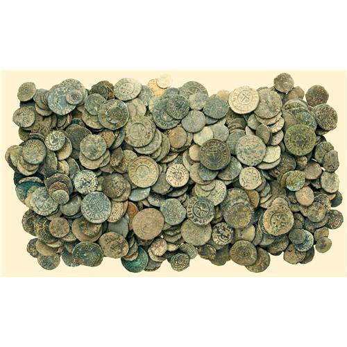 Lot of 650+ uncleaned bronze coins. A diverse lot, the vast majority Armenian, ranging in size from AE15 to AE28, including numerous Tanks of Levon I (1198-1219), together with a smattering of earlier Greek and Roman issues (about 30 or so pieces) and some later Islamic emissions.