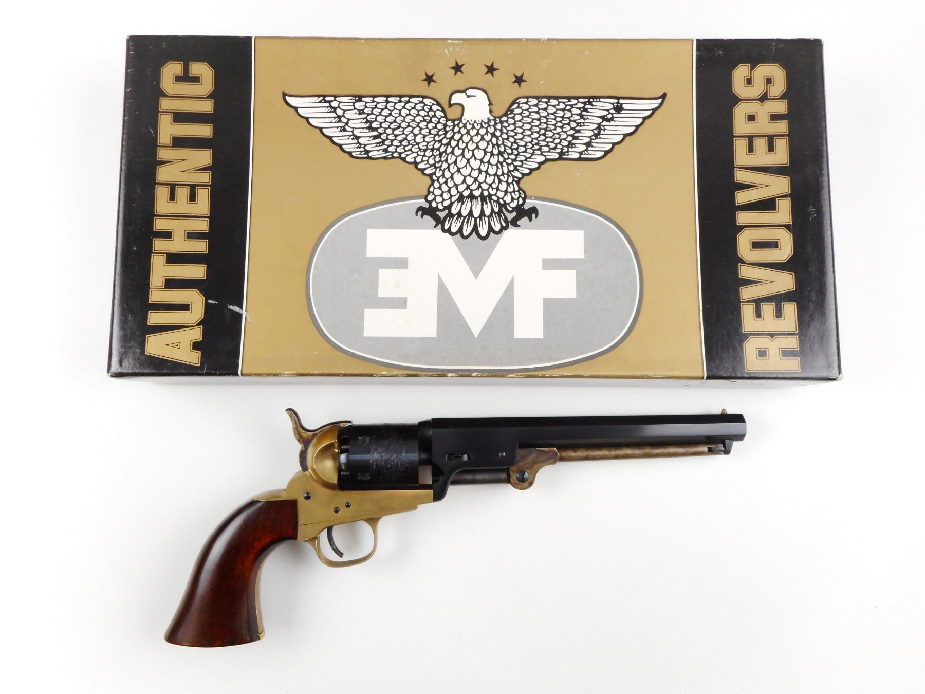 ARMI SAN MARCO , MODEL: COLT 1851 NAVY REPRODUCTION , CALIBER: 36 PERCUSSION , COMES WITH ORIGINAL BOX, 6 SHOT CAPACITY, BRASS BEAD FRONT SIGHT AND NOTCH HAMMER REAR SIGHT, BRASS FRAME, PLAIN WOOD GRIP PANELS, CASE HARDENED HAMMER AND RAMMER, HOLDS COCK, INDEXES WELL, ACTION IS TIGHT, SHOWS VERY LITTLE HANDLING MARKS , SERIAL # B64207 , STOCK # 4121 , ACTION: REVOLVER , BARREL LENGTH: 191MM , CONDITION: 8/10 , CLASS: CANADIAN RESTRICTED CLASS