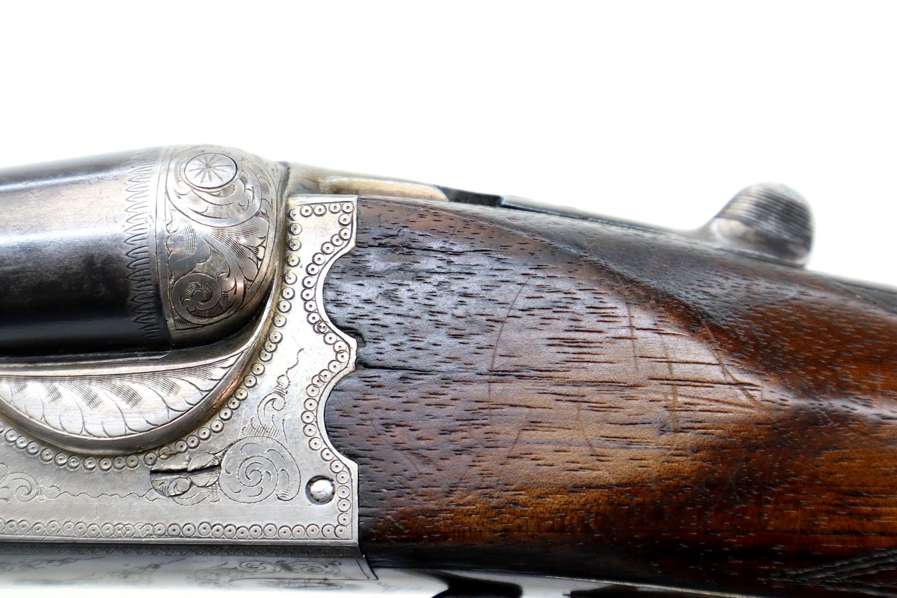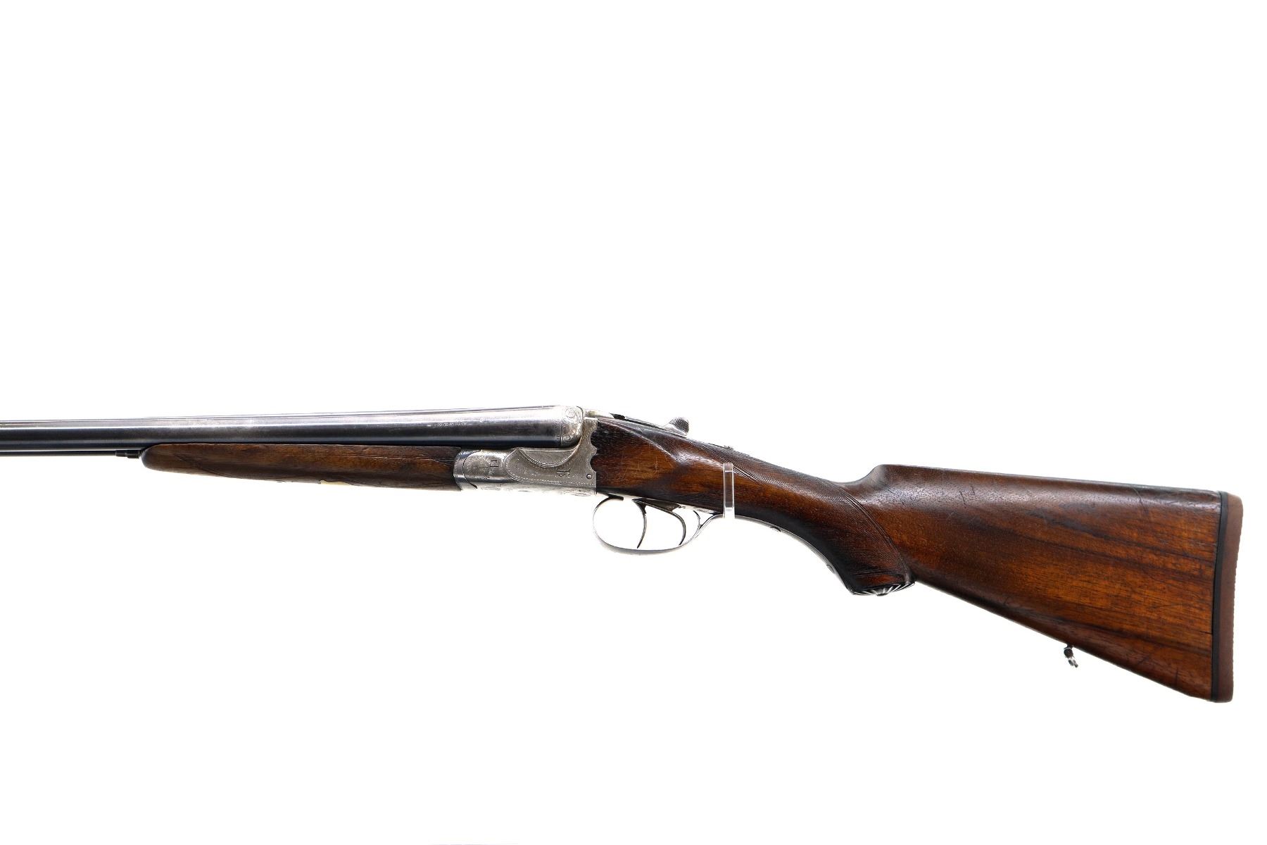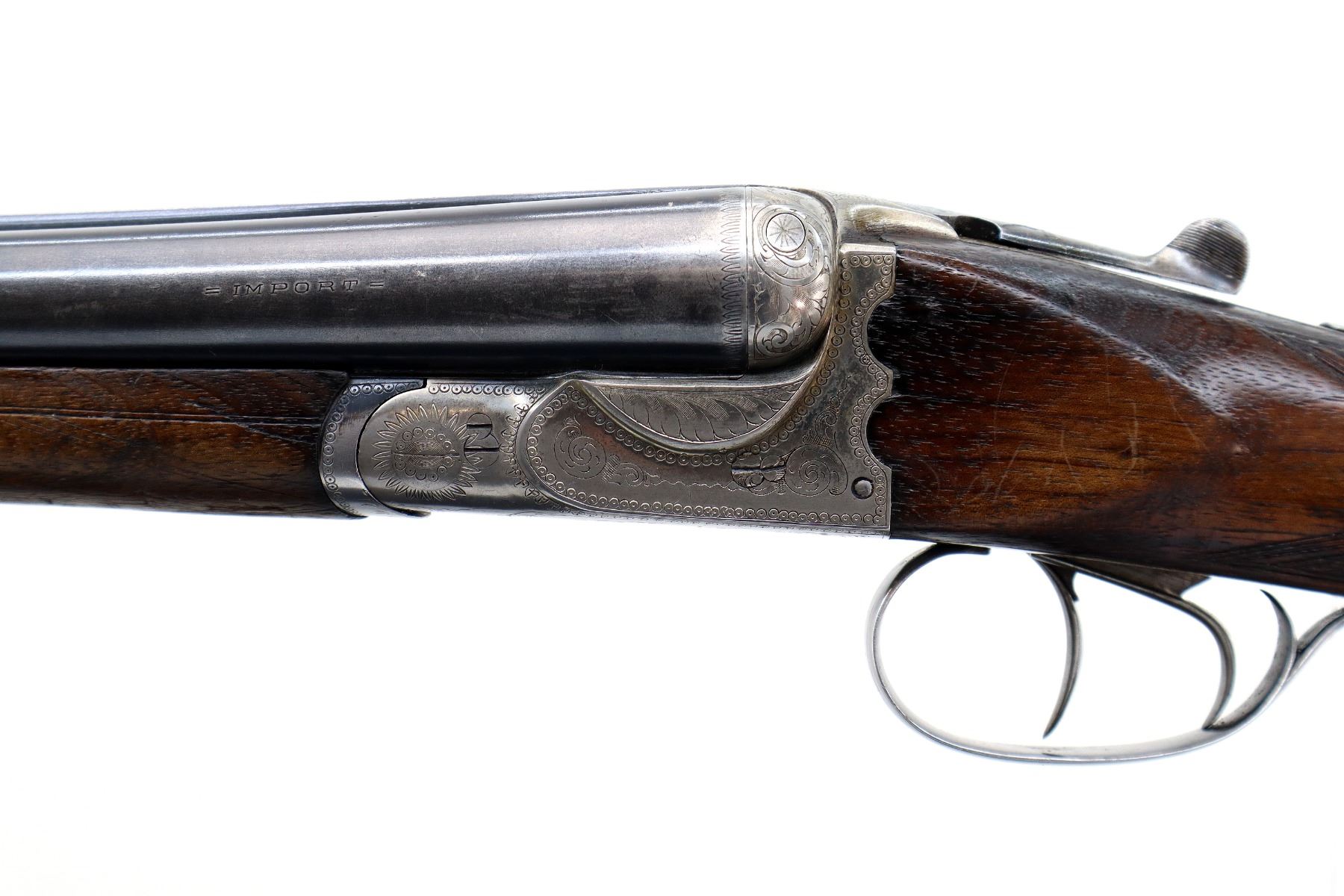 Main Description: Brass bead, blued barrels with raised rib, engraved silver receiver, automatic safety, extractor, double triggers. Two piece wood stocks, checkered forearm with brass plate, checkered pistol grip, small crack behind upper tang and left side of receiver, brown rubber recoil pad, stock cracked and repaired at toe, grip cap, sling swivels.