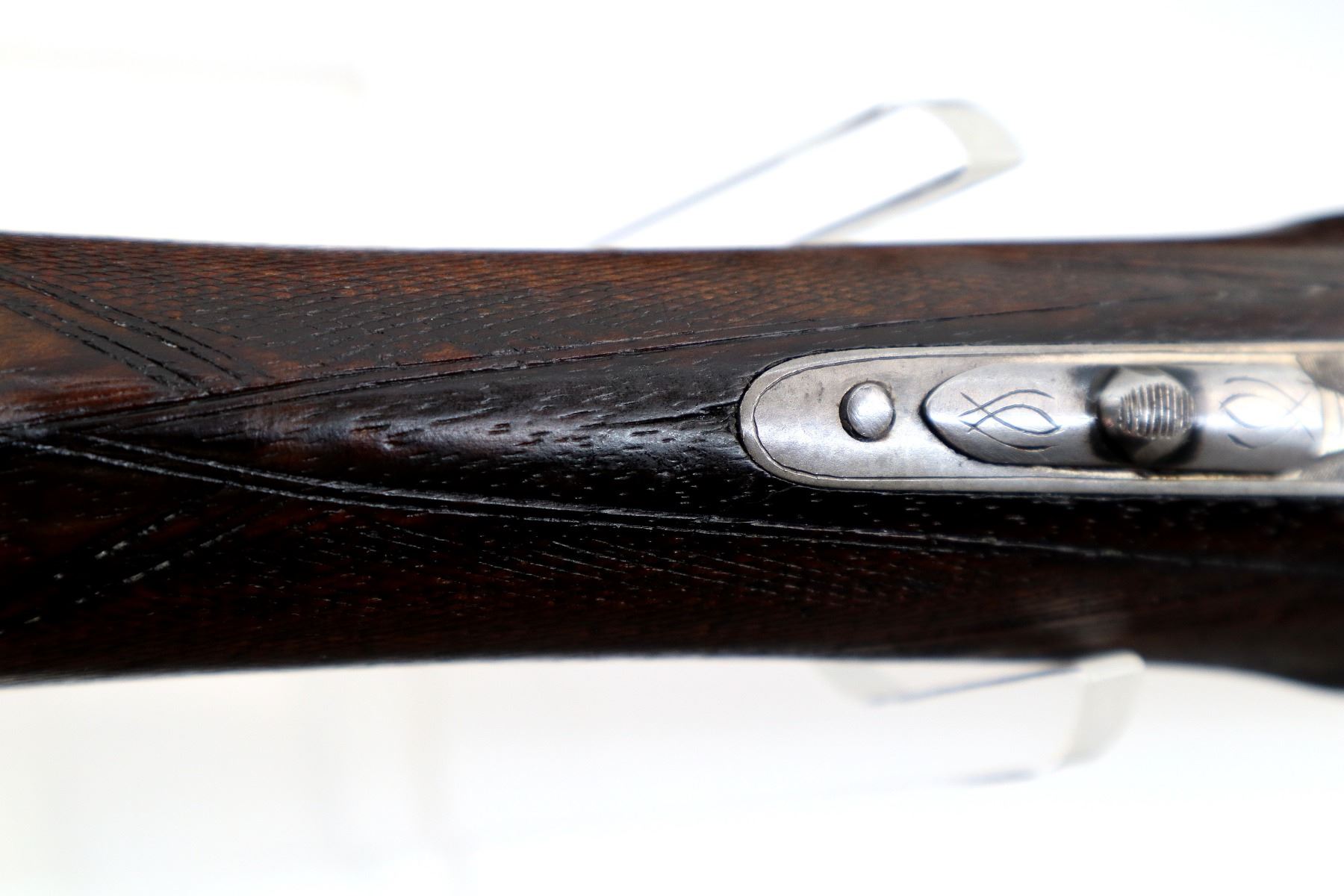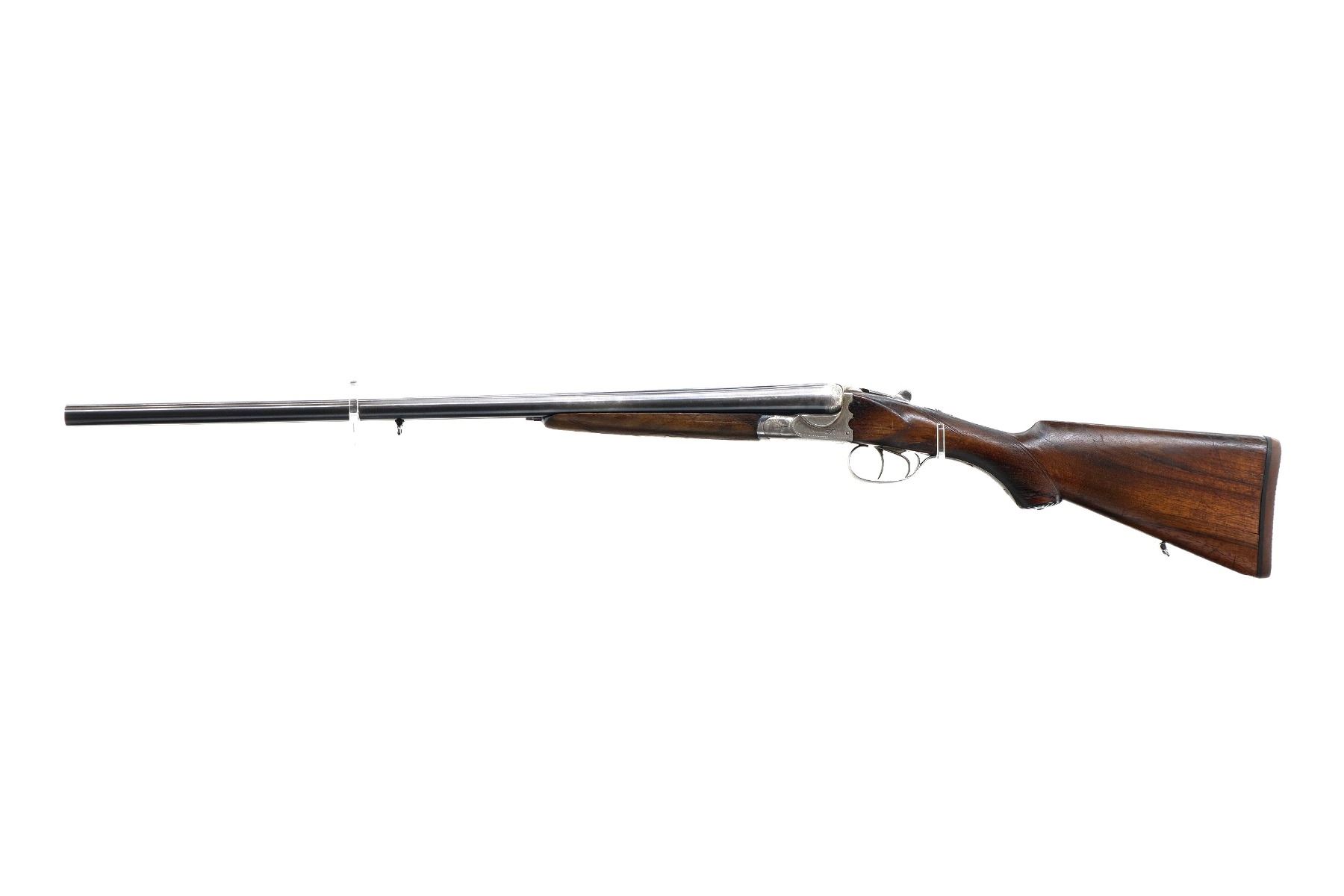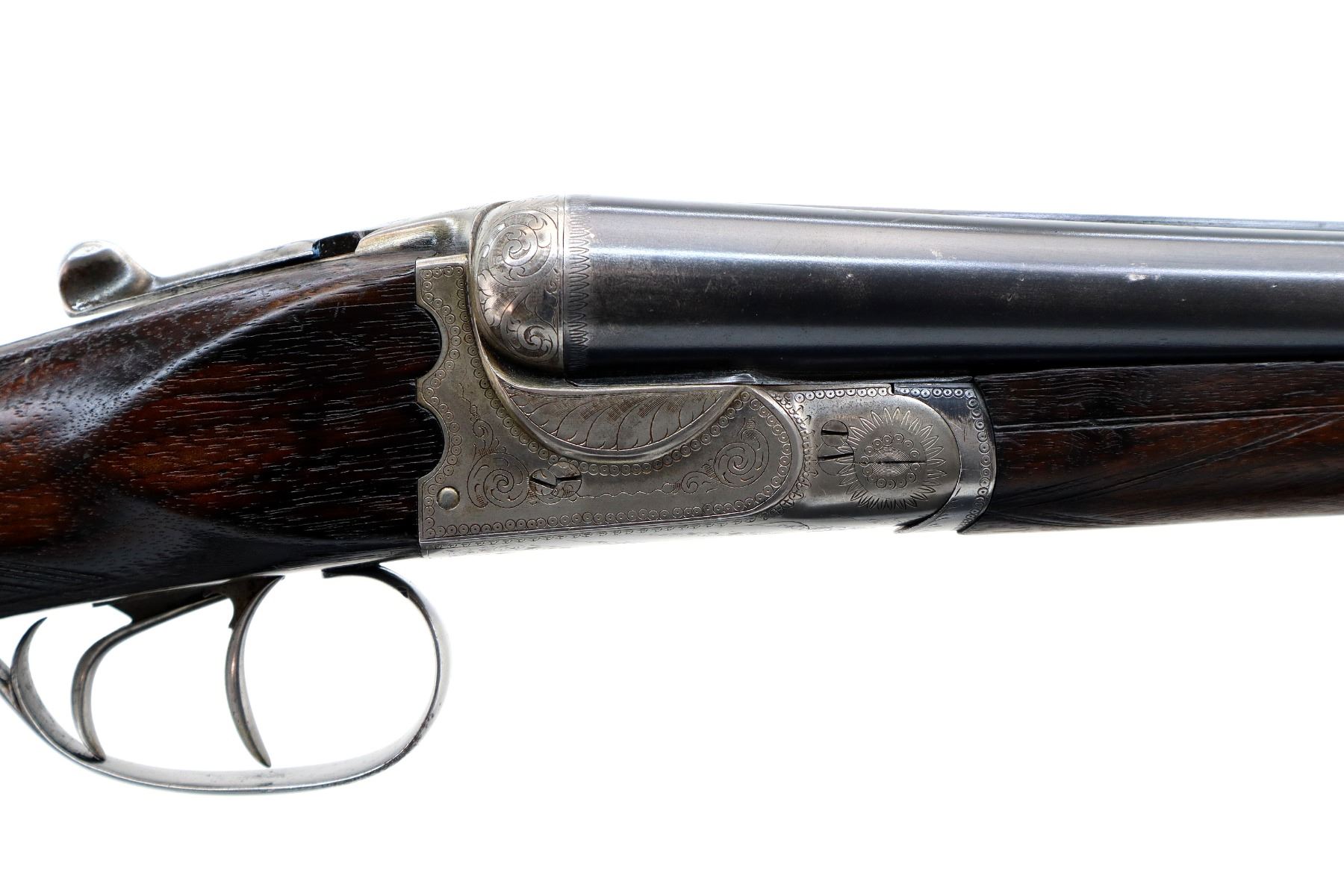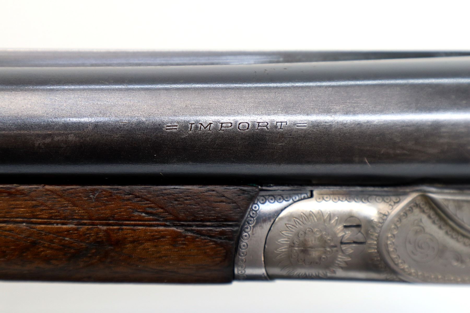 Main Description: Brass bead, blued barrels with raised rib, engraved silver receiver, automatic safety, extractor, double triggers. Two piece wood stocks, checkered forearm with brass plate, checkered pistol grip, small crack behind upper tang and left side of receiver, brown rubber recoil pad, stock cracked and repaired at toe, grip cap, sling swivels.