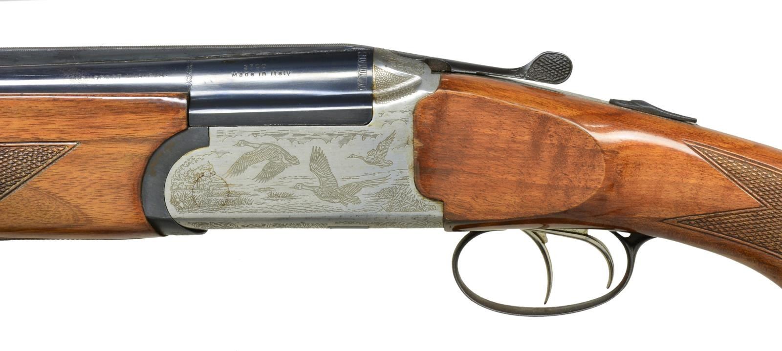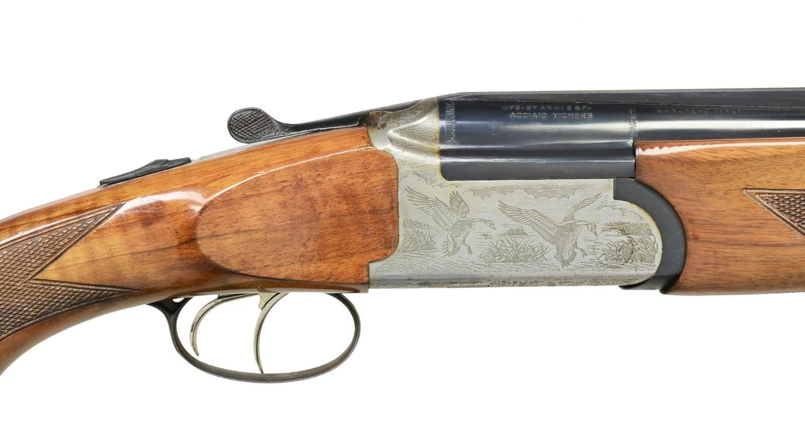 Cal. 10 Ga., 3 1/2". S# A2999. Bbls. 32" VR w/ fixed Full & Full chokes. Fiber optic red front sight w/ brass mid bead. Satin finished boxlock action w/ Marsh scene & Canadian Geese ornamentation. Dbl. triggers. Extractors. Forearm & pistol grip stock of checkered walnut. LOP: 14 3/4" over original pad. Weight: 9 lbs., 6.4 oz. CONDITION: bbls. & action retain over 95% finish. Wood shows sm. finish chips w/ scattered scratches & marks. Stock has a hairline crack behind top tang. Very good bright bores. (20-1581/DS). MODERN. $500-700.