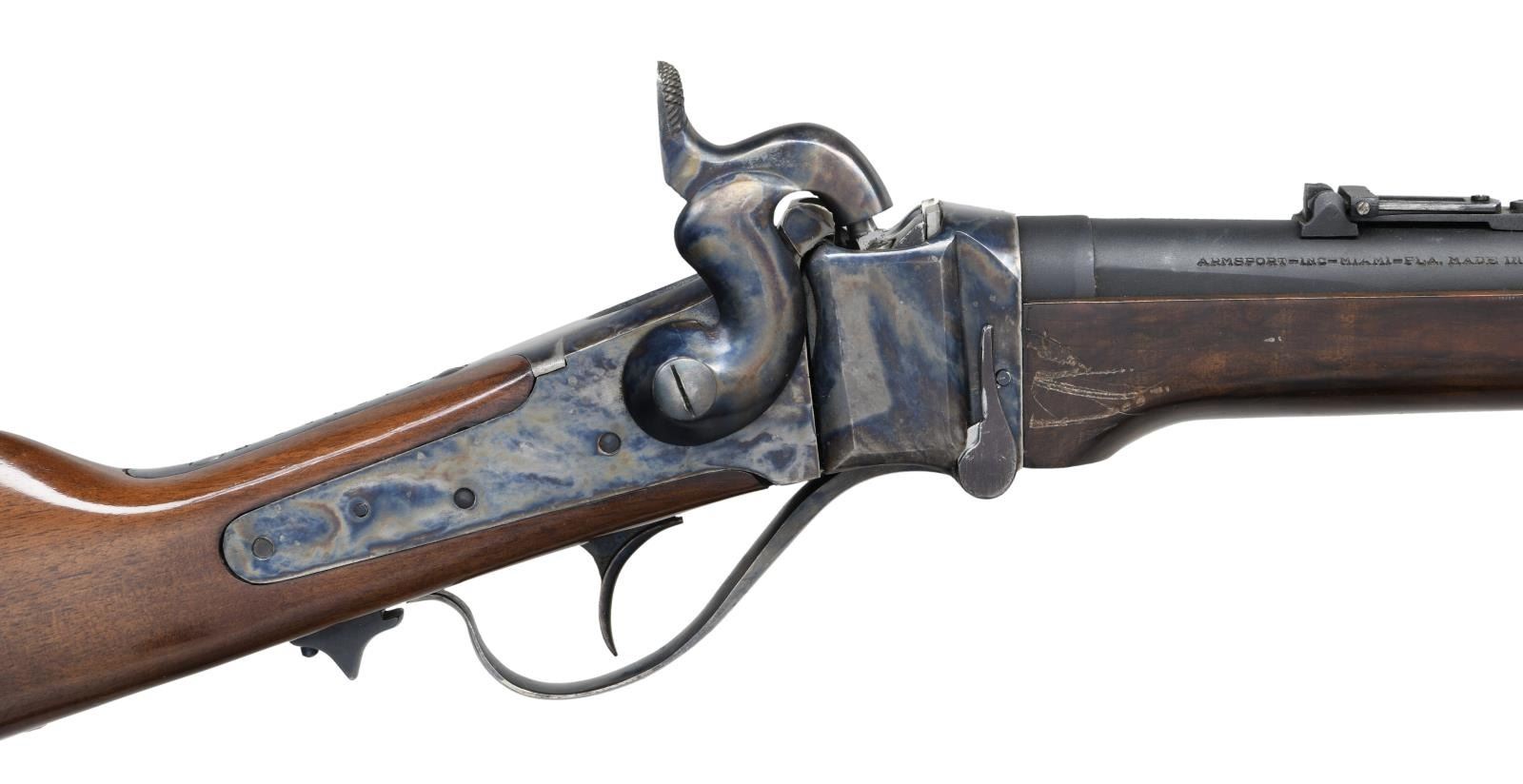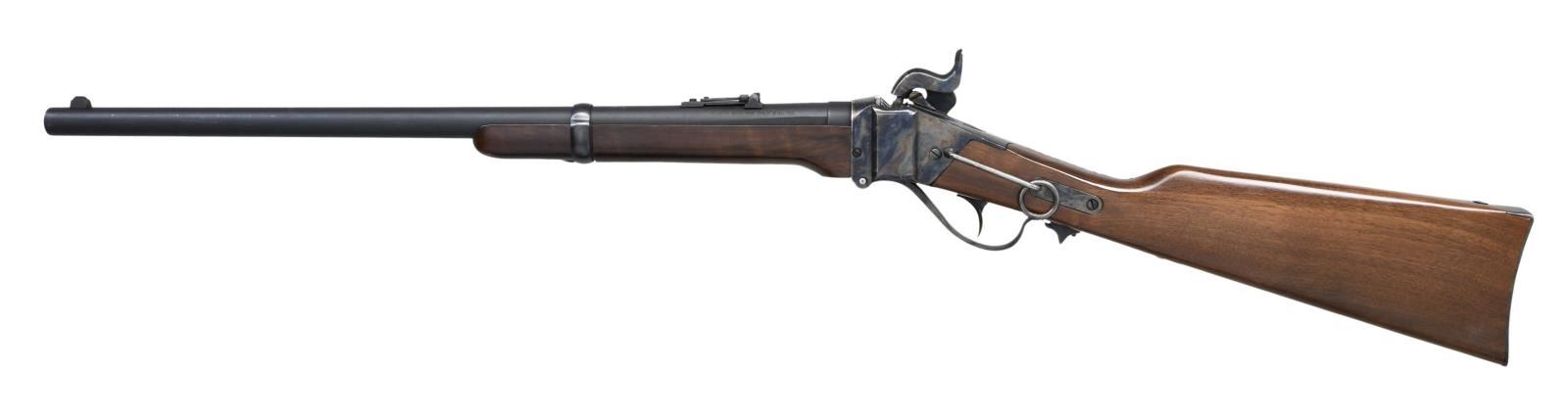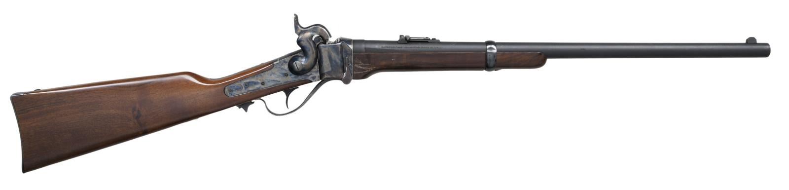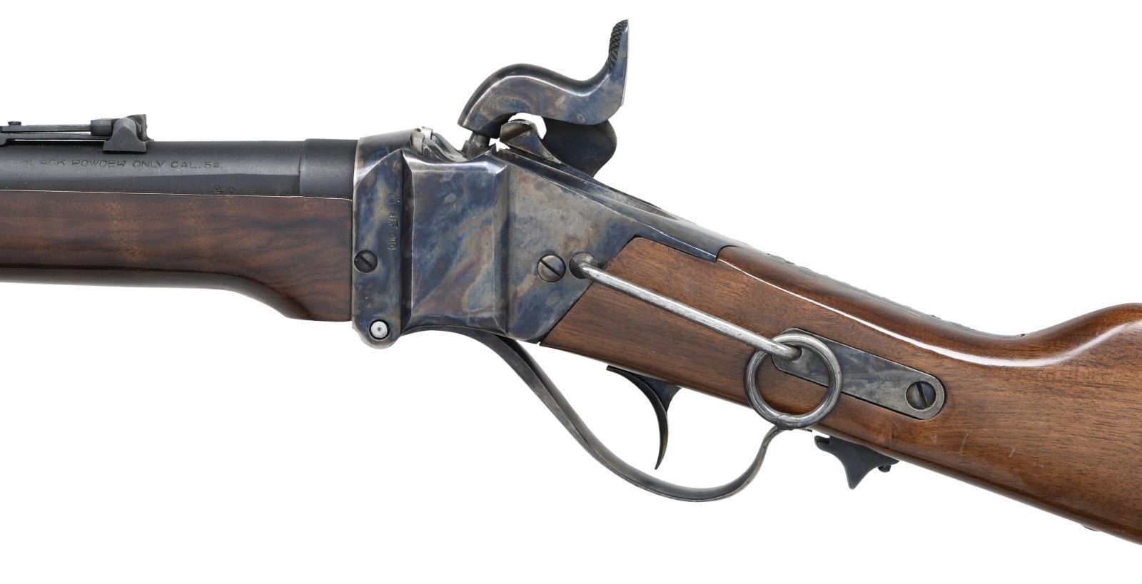 Cal. .54. S# 40159. Bbl 22 1/12". Case color hardened frame, hammer, lever, trigger, and buttplate with matte blued barrel and barrel band. Solid wood buttstock and forend. CONDITION: metal components retain the majority of their original factory finishes, exhibiting some spots of mild wear and scattered superficial marks from handling and storage overall. Mirror bore, exhibiting strong rifling throughout. Stock shows scattered with some scratches on the right side of the forend. (01-23714/MLW). ANTIQUE. $400-600.