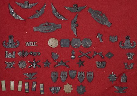 Lot of 50+ pieces of Army insignia, black, includes those for a chaplain, marksman, Signal Corps, airmen, missiles, various officers, etc.
