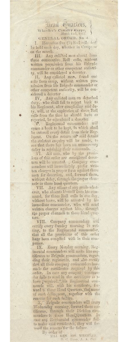 Field printed broadside, 3 1/4" x 10 3/4", "Head Quarters, Wheeler's Cavalry Corps", [Mar. 1, 1863], General Order No. 4 issued by cavalry Gen. Joseph Wheeler setting forth ten rules for commanders concerning roll calls and guidelines for determination of whether a soldier has deserted. In part: "...All men who are considered deserters will be arrested...Any enlisted man, found one mile from camp...will be considered a deserter...Any officer...who absents himself...for three roll calls in one day...will be arrested...".  Light toning, else very good. Desertion was a constant problem for both sides during the war.