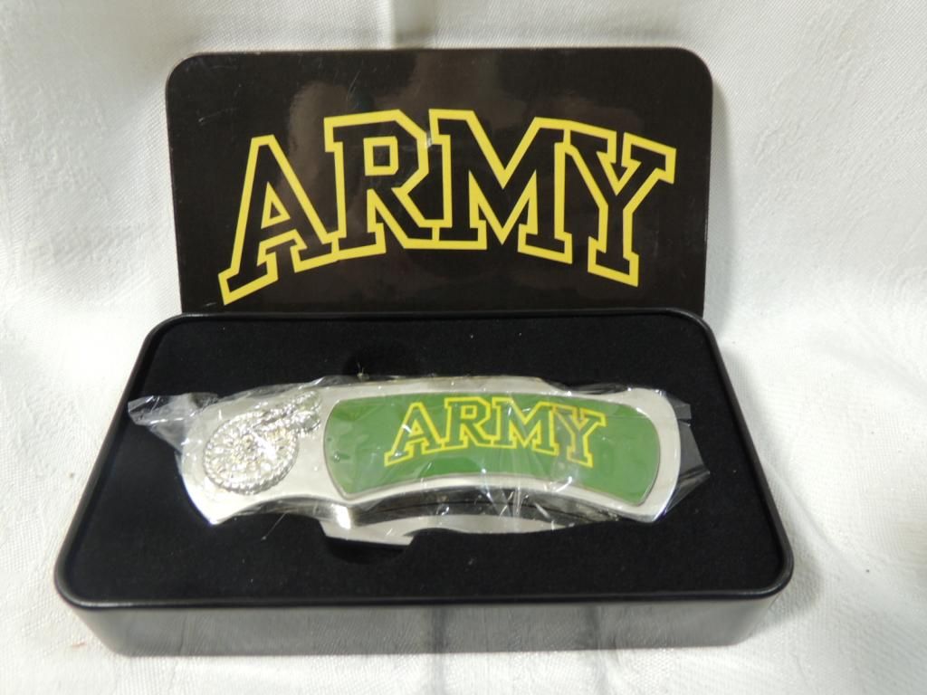 ARMY POCKET KNIFE LOCK BACK MILITARY FOLDING KNIFE IN COLLECTORS TIN ARMY PANEL ON BOTH SIDES COMES IN A METAL DISPLAY CASE BLADE LENGTH 3-1/2" BLADE THICKNESS 1/16" AND ALMOST 1" WIDE CLOSED LENGTH: 4-1/2" BLADE MATERIAL STAINLESS STEEL. AS SHOWN SEE PHOTO FOR MORE DETAILS.