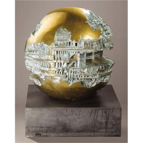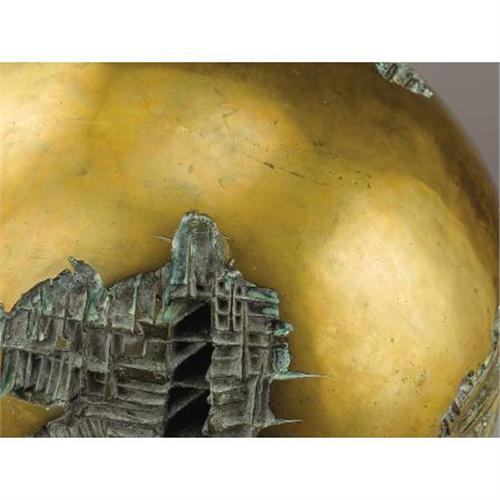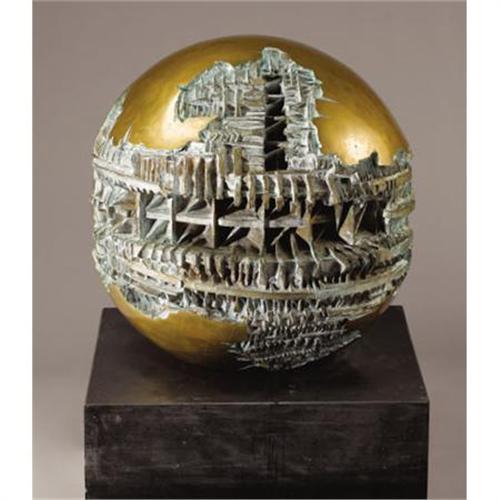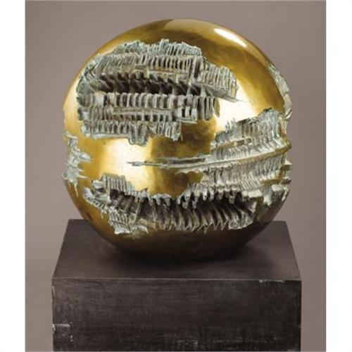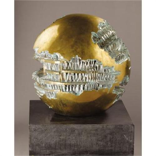 <B><BR>ARNALDO POMODORO (Italian, b. 1926)</B></I><BR><I>Piccolo Sfera</B></I>, 1963<BR>Bronze<BR>20 x 20 x 20 inches (50.8 x 50.8 x 50.8 cm)<BR>Ed. 1/2 <BR>Presented on a black stone base<BR> <BR>PROVENANCE:<BR>Felix Landau Gallery, Los Angeles, California;<BR>Purchased from the above by the current owner in 1963.<BR><BR>In 1963, the year he produced <I>Piccolo Sfera,</B></I> the self-taught Italian sculptor Arnaldo Pomodoro won a major prize at the Sao Paolo Biennial for his highly polished cast bronze spheres whose surfaces he gouges out and scars. The Brazilian award was followed by a top prize at the Venice Biennale a year later, which secured his reputation as an important new talent. <BR><BR>Pomodoro, whose name means "golden apple," or more colloquially, "tomato" in Italian, began his career making jewelry after rigorous training as an architect. He slowly moved into the realm of sculpture, bringing with him a feeling for exquisite detail and craftsmanship, geometry, texture, and the palpable tension present in man's relationship to the technological age. He worked first in more malleable lead and pewter to initiate the idea of his expressionist "boxes." He subsequently moved into the more demanding processes of cast brass and bronze.<BR><BR>For the artist, who lives and works in Milan, the starting point is always solid geometry; the expression of tension begins as he scores, gouges out, and selectively cuts into his spheres, cylinders, cubes and disks. "The contrast between the polished and torn surfaces is precisely the difficulty of the individual to adapt to the new world," he feels. What he finds within these solid geometries evokes a strange and curious crystalline imagery drawn from the machine. As a writer for <I>Time</B></I> noted on December 3, 1965: "His slabs look like the innards of computers, his spheres like ball-shaped printing heads for IBM typewriters. He did a façade for a Cologne school that is 78 feet high by 27 feet wide and entitled <I>Grand Homage to Technological Civilization</B></I>. He calls other slabs <I>Radars</B></I> because they strike him as "capturing feelings."<BR><BR>Rather than being at odds with the machine, Pomodoro searches for harmony between technological society and man. His sculpture probes for a tactile solution that will satisfy both the intellect and the emotions. The complicated crevices and fissures in <I>Piccolo Sfera</B></I> interrupt the polished surface to produce visual and tactile counterpoints. The effect seems to suggest the chasm between machine-age perfection and man's inner doubts.<BR><BR>The present owner purchased <I>Piccolo Sfera</B></I> in 1963, the same year it was made. Like many of Pomodoro's ambitious cast works, <I>Piccolo Sfera</B></I> was produced in an extremely small edition. This is one of two.<BR><BR>Arnaldo Pomodoro is a recipient of the 2008 Lifetime Achievement Award by the International Sculpture Center.
