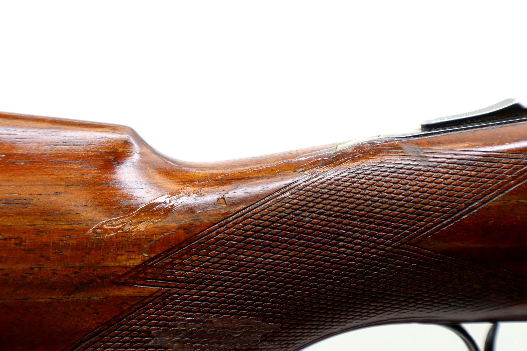 Main Description: Orange fiber optic front bead, blued finish, vent rib, manual safety, action does not function or fire correctly, missing bottom ejector, single trigger. Two piece wood stocks, checkered forearm which is broken and repaired, checkered Pistol grip chipped and cracked behind receiver, grooved black polymer butt plate. Missing rear swivel hole is present has a front swivel stud.