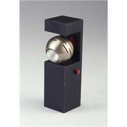 ARREDOLUCE desk lamp with rectangular enameled metal base, inset with spherical brushed chrome fixture with adjustable magnetic mount. Some pitting to spherical fixture, and minor enamel loss. Labeled Made in Italy/Arredoluce/Monza. 9 1/2" x 3" sq. $850 - 1,250