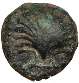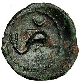 ARSE-SAGUNTO, sagunto (valencia). Sexto. R/ Delfín a der., encima creciente. AE 1,4 g. I-2065. VILL-309/36. Pátina verde irregular. MBC. Rara.